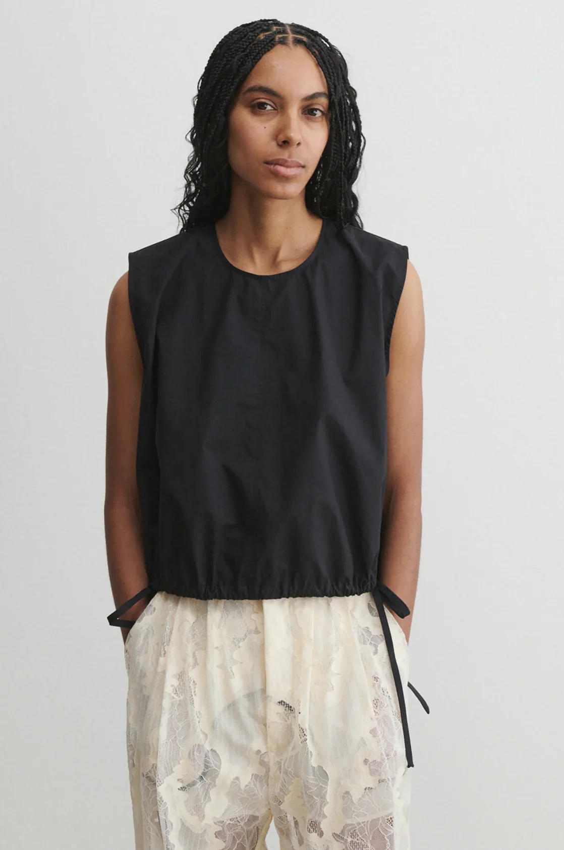 Sleeveless round neck top cut from crisp cotton. Finished with a drawsting at the hem.
