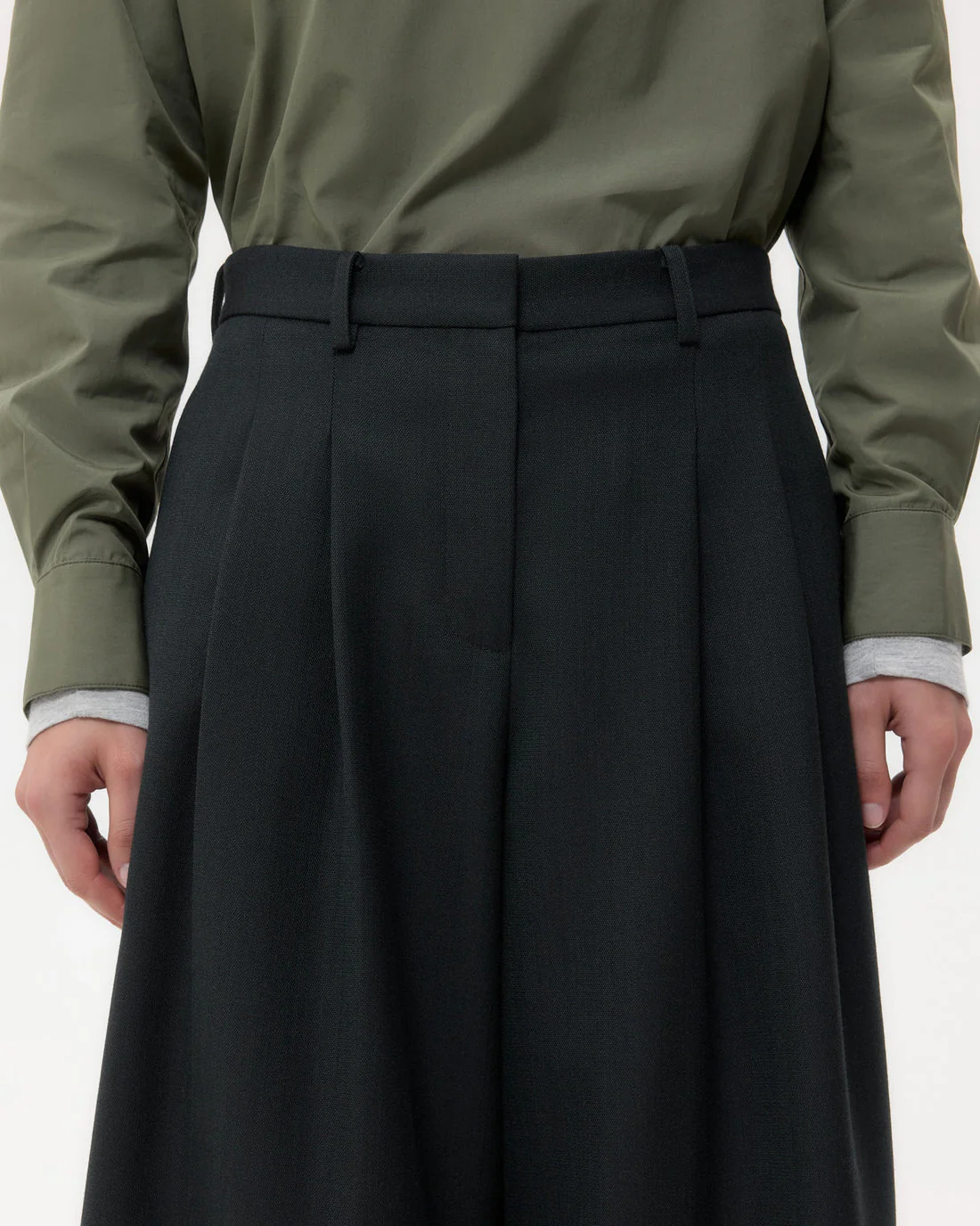 Mid-rise, wide leg pleated suit trouser in structured wool suiting. The Avery is relaxed through the hip and leg. Complete with side pockets, back welt pockets, belt loops, concealed zip, and hook and eye closure.