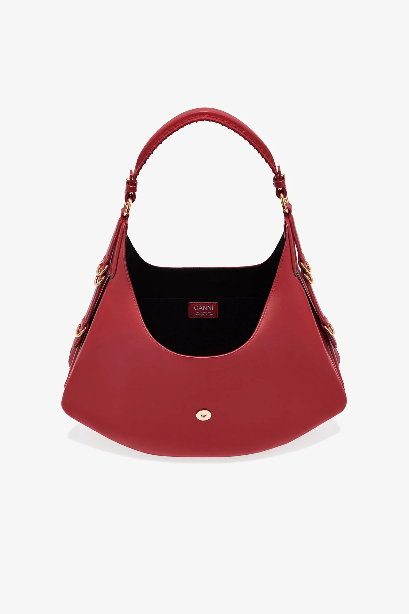 This bag features a soufflet-style silhouette, a shoulder strap and D-ring detailing at the side. The bag has a closure tab with the signature GANNI Butterfly clasp in gold-tone, 1 main compartment and an inside open pocket.