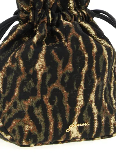 'Metallic Bou Bucket' pouch in jacquard with metallic effect animal print, drawstring closure and metal Ganni Bufferfly logo details.