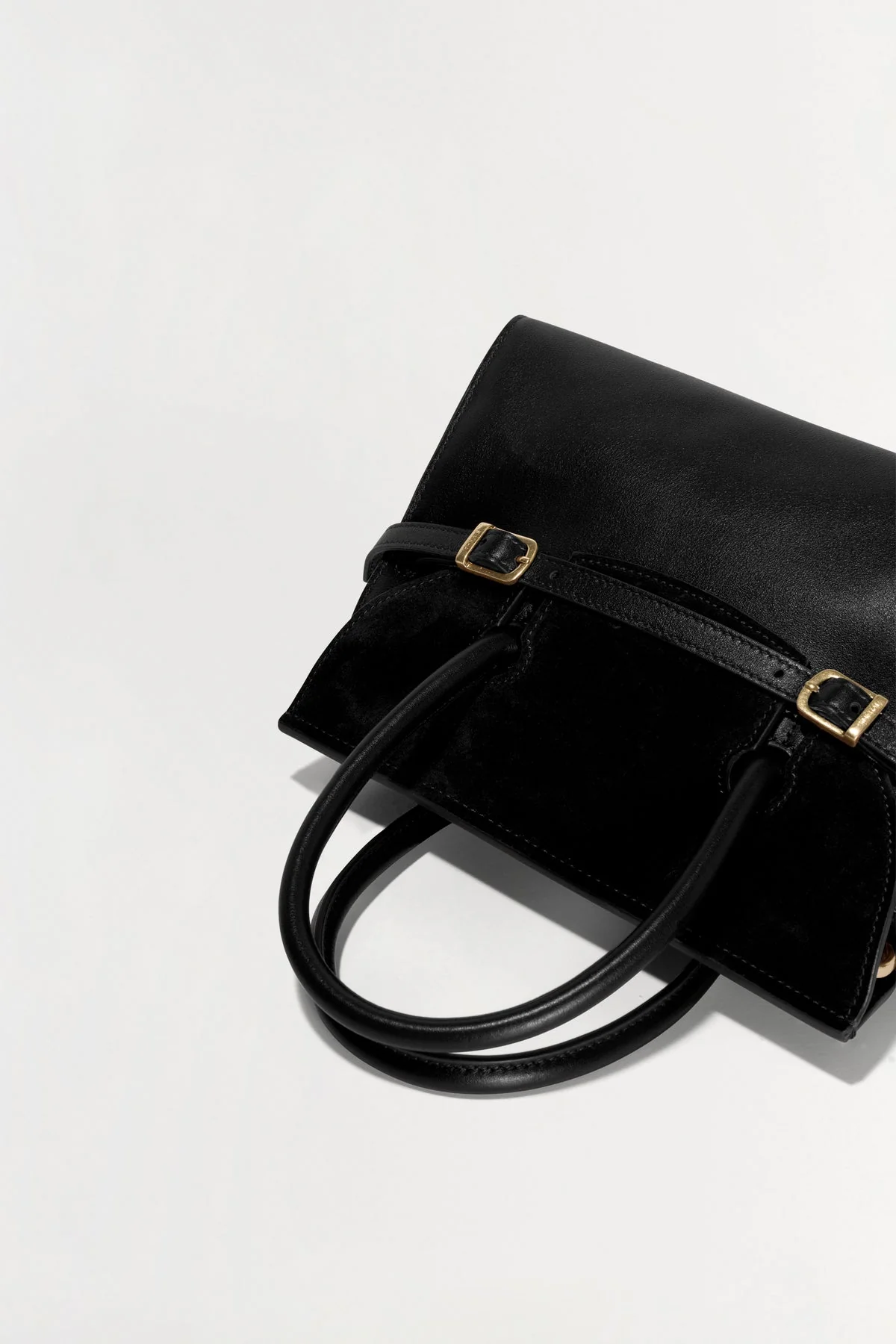 Sleek leather meets soft suede in this compact tote, finished with gold-tone buckles and a clean, structured shape.