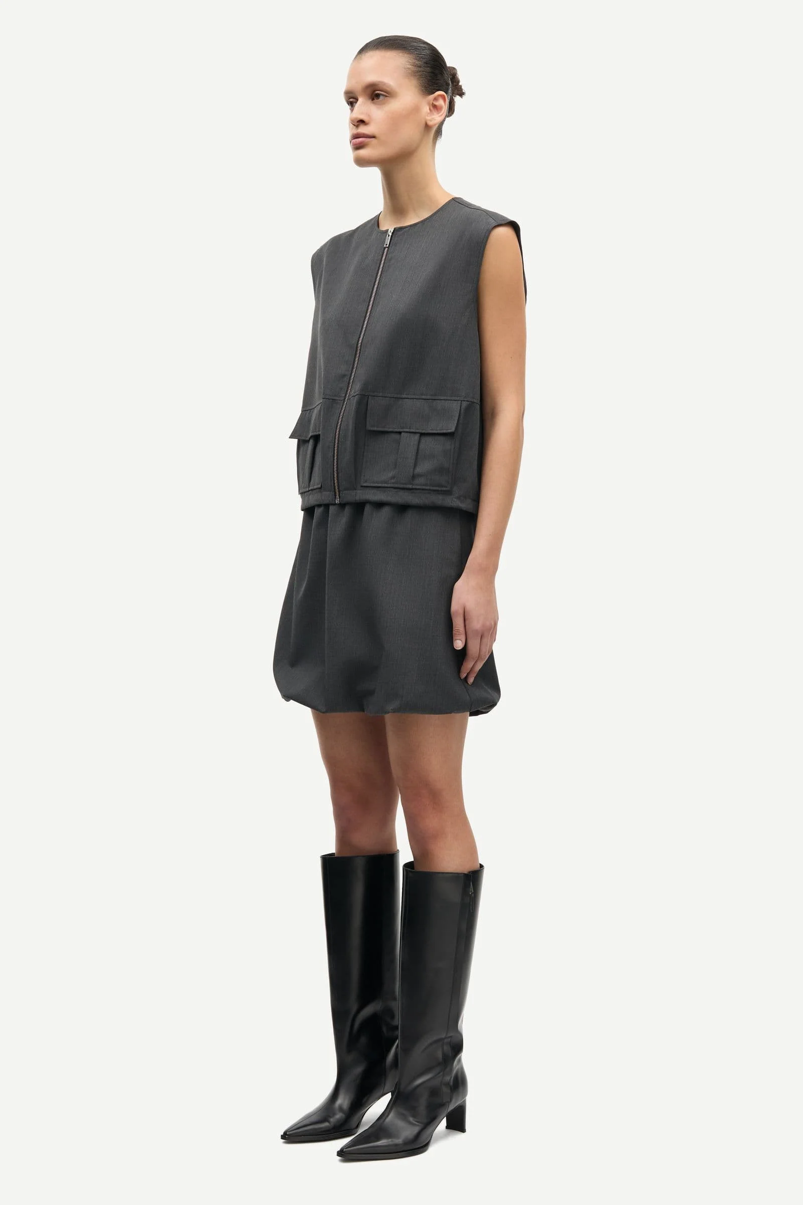 Vest with an oversized fit. Zipper closure on the front. Patch pockets with flaps on the front. Drawstring at the bottom hem. Main lining made from [desirable material/blend]/Fully lined. Main material made from a wool-blend.