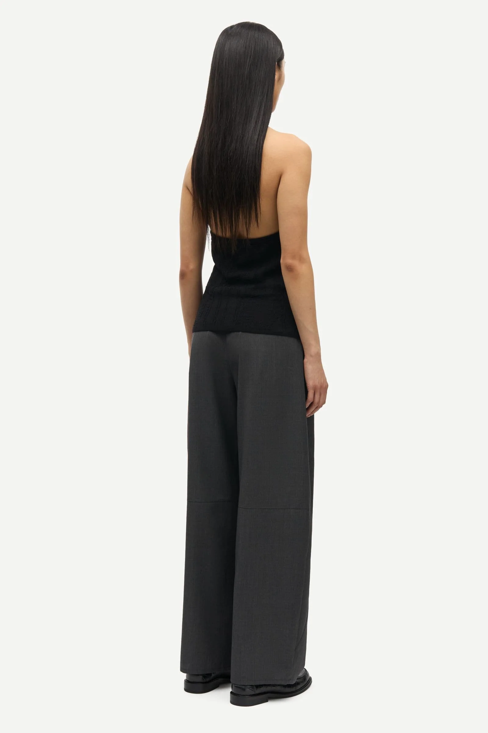 Mid-waist trousers with a loose fit and curved leg. Hidden hook and zipper closure at the fly. Elasticated insert at the back of the waistband. Side slit pockets on the front and welt pockets on the back. Main material made from a blend of recycled polyester and wool.