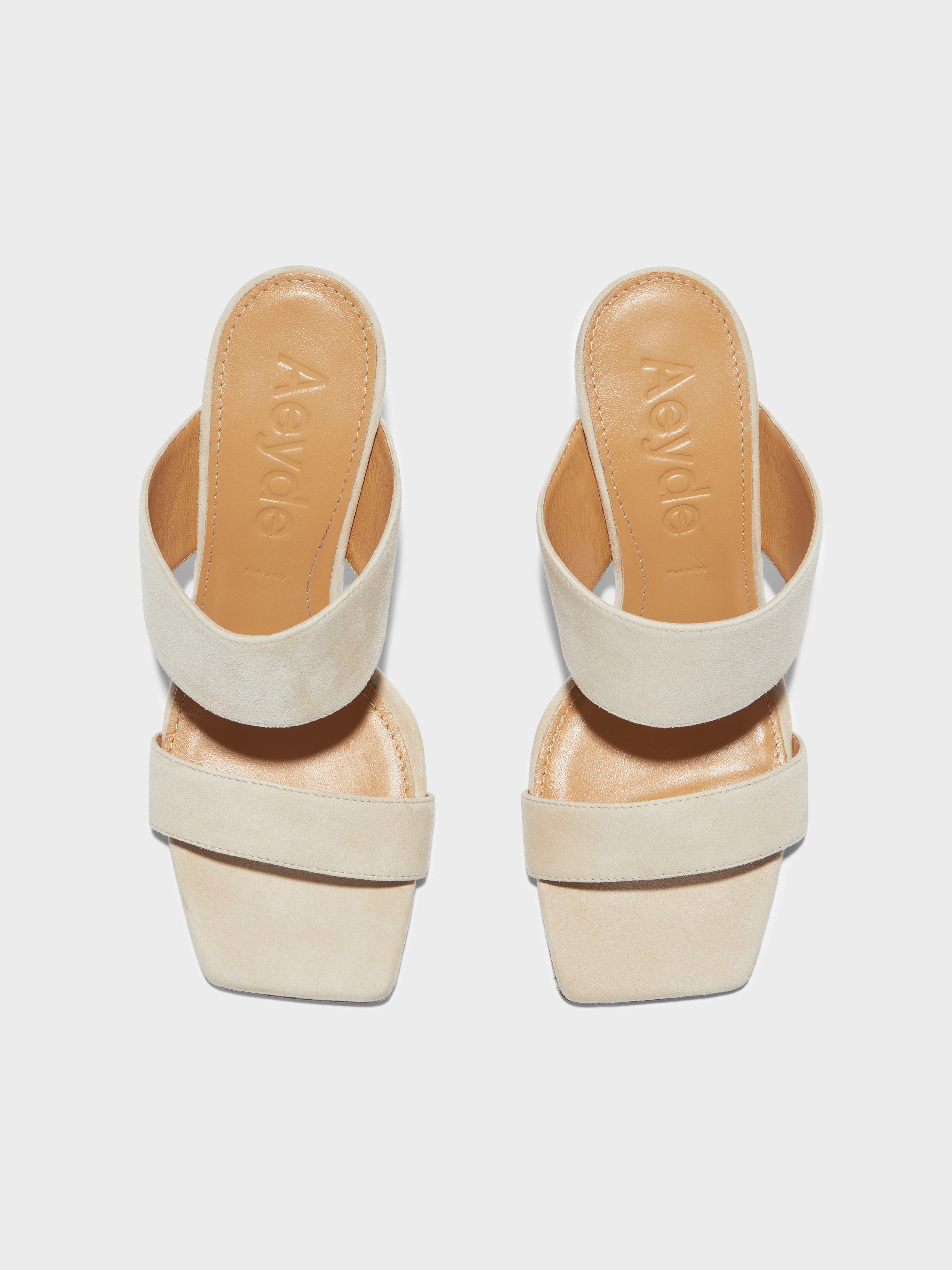 Varvara are Aeyde's elegant double strap heel. This pair is crafted from beige kid suede.